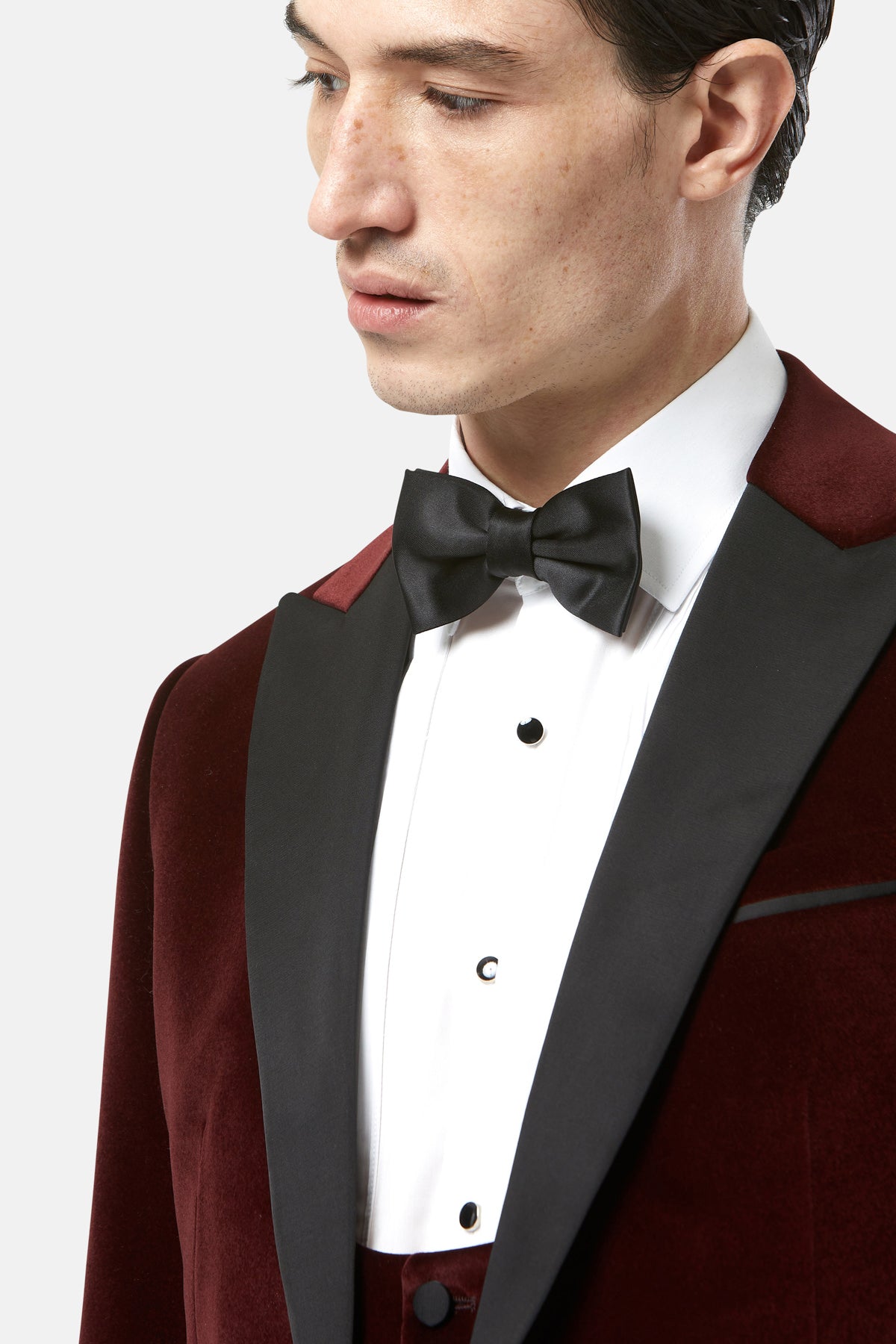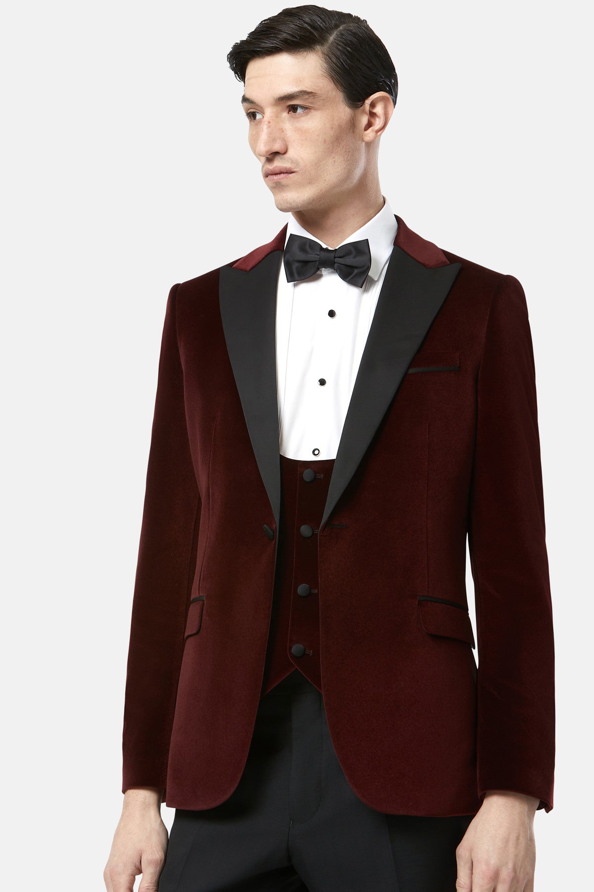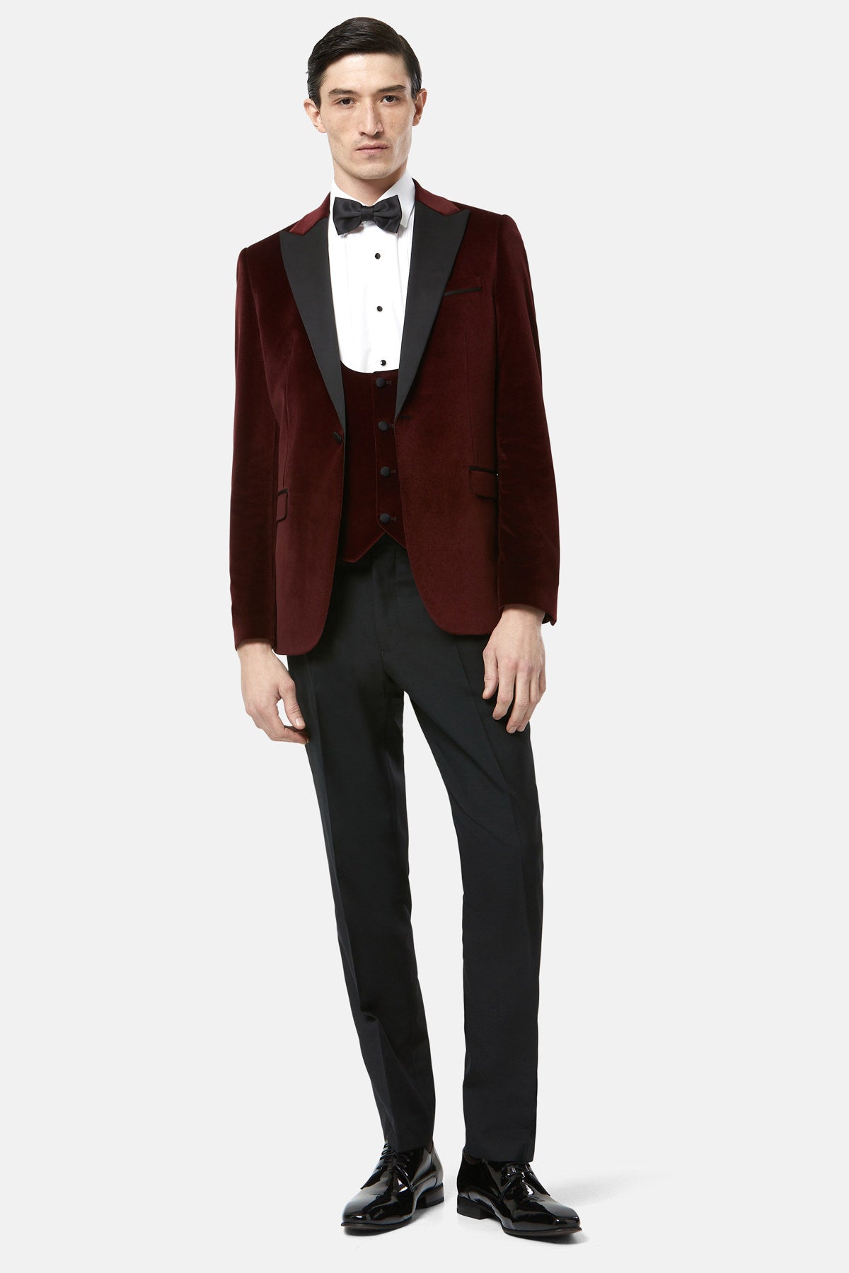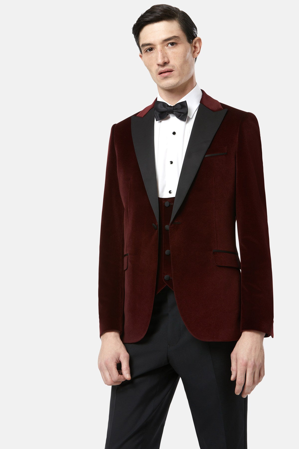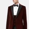 An elegant tuxedo by Benetti Menswear. Securing with a single-button closure, and matched with our new low scoop waistcoat, this refined tuxedo is designed in soft velvet. Silk-blend accents add an elevated touch to this tailored fitting-piece.