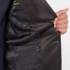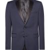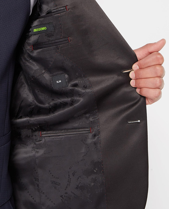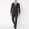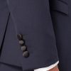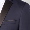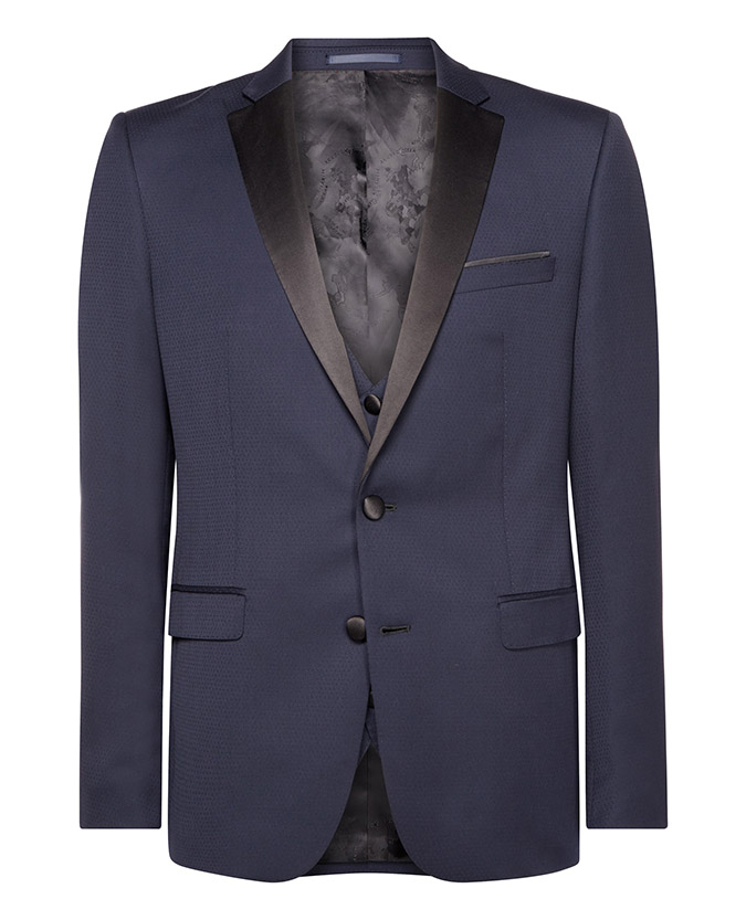 Navy slim fit wool-rich mix and match suit with fabric interest, slim notched satin lapels. Single-breasted, button two, jett flap side pockets, side vents and satin trim details.